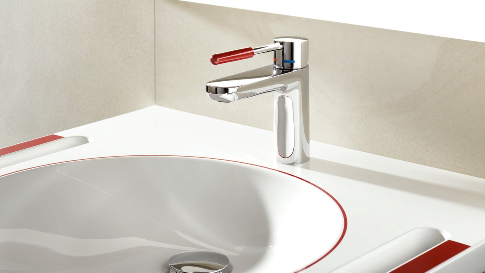 Qualitative Studien zur Farbwahrnehmung von an Demenz leidenden Menschen zeigen, dass die Farbe Rot am ehesten wahrgenommen wird. Aus diesem Grund wurden die farbigen Markierungen des Waschtisches rot gestaltet.