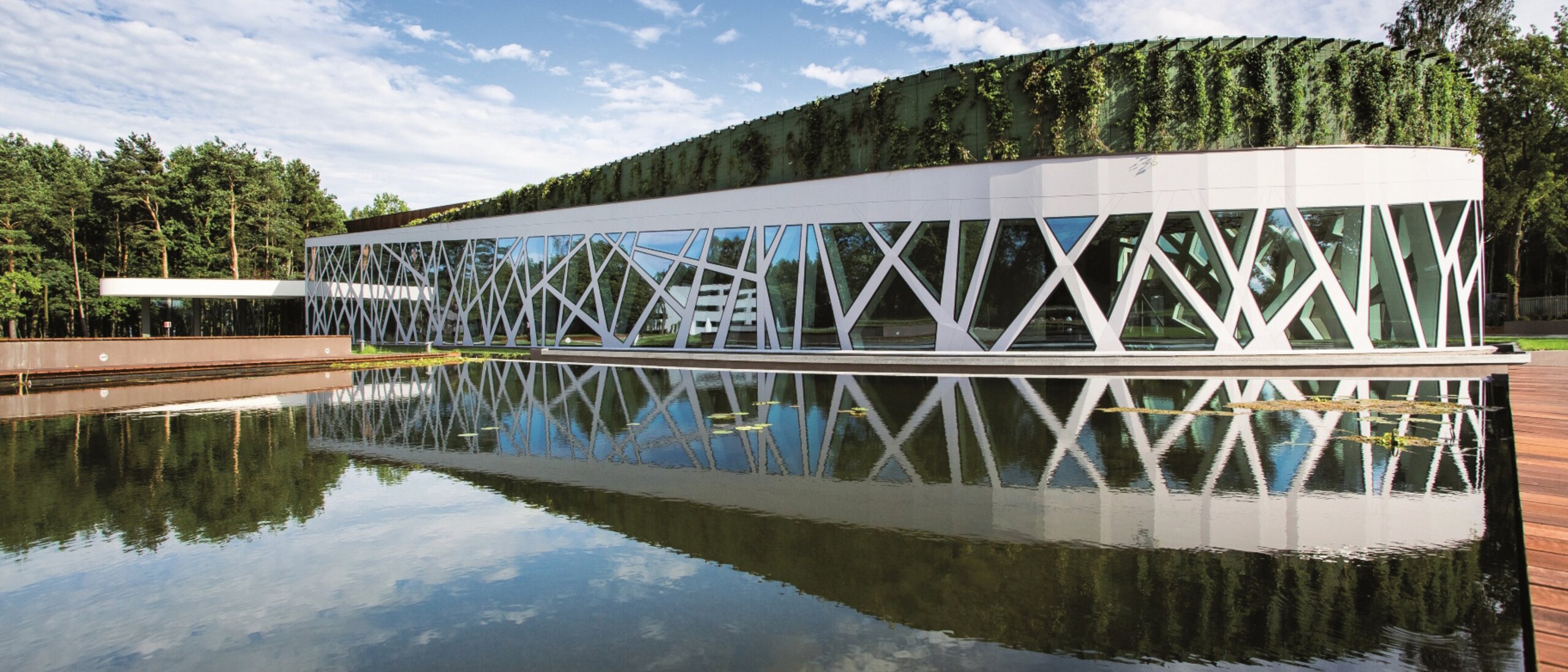 The surrounding nature was also the inspiration for the hotel's architecture and interior design. The façade is reminiscent of tree trunks whose branches overlap and merge into a dense treetop. This organic motif is continued from the cafeteria, through the corridors to the spa area, with tree and water elements being taken up in the guest rooms. The organic components are complemented by strictly geometrically designed forms.
