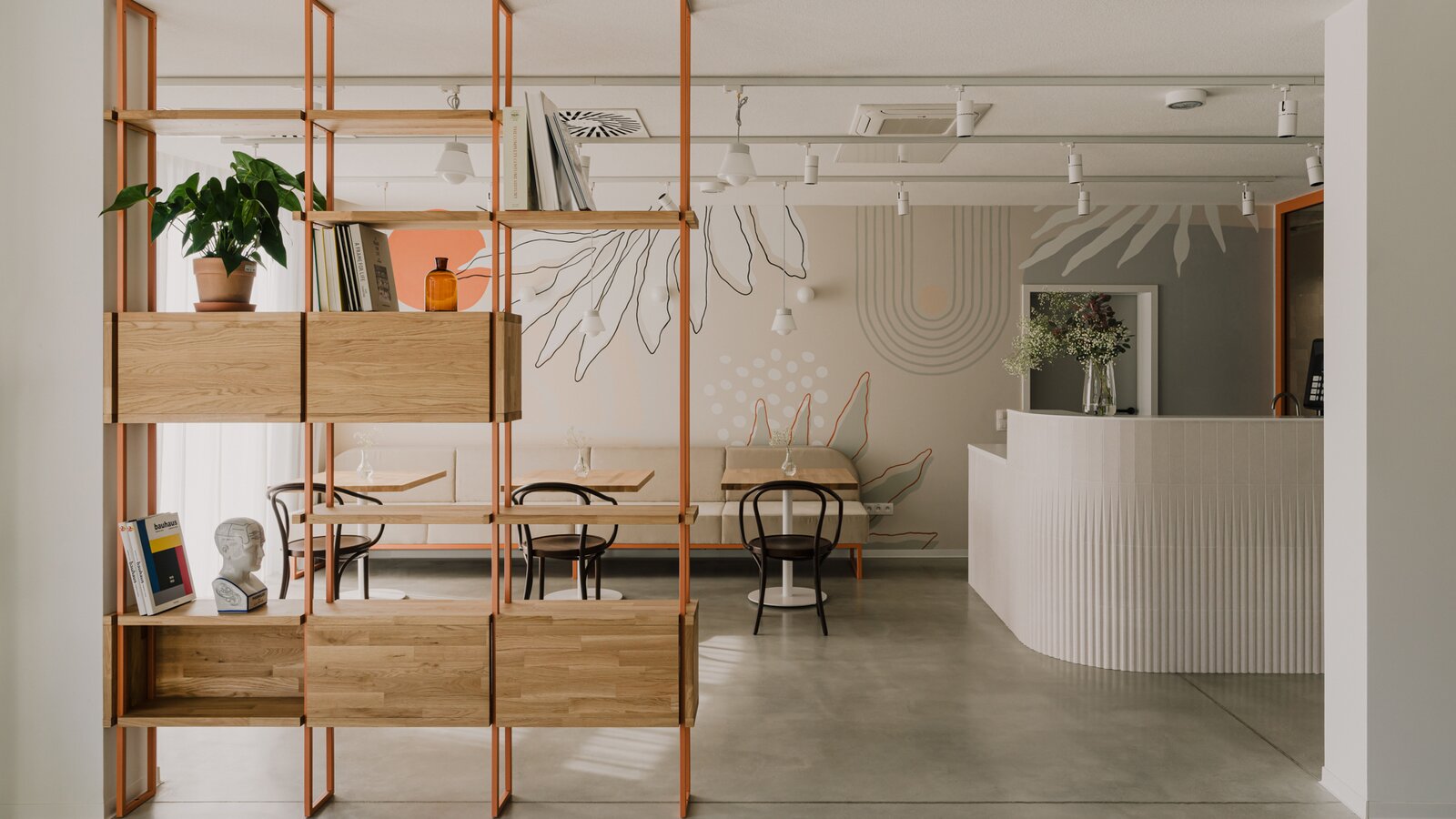 The colour concept of the interiors is inspired by the surrounding nature: Warm earth tones are reflected in the furniture and building hardware. Paintings with motifs from the plant world and seascape decorate the café, dining room and conservatory, while graphic ornaments on various walls also establish a direct floral connection.