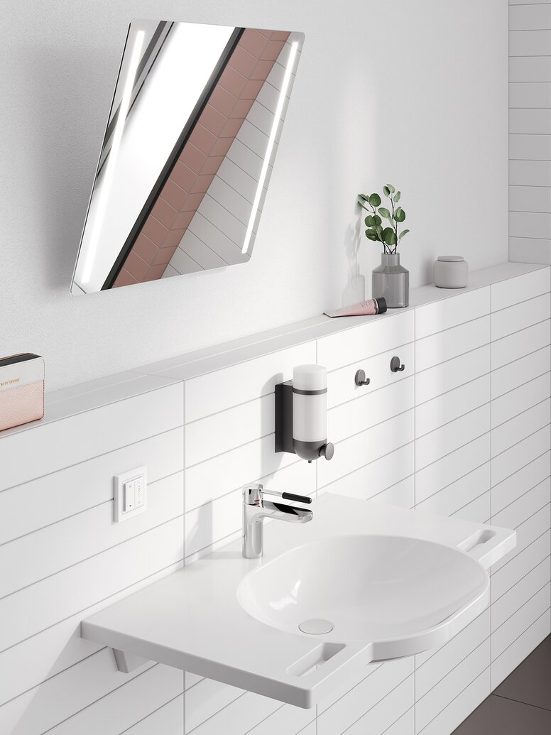 HEWI's motorised tilting mirrors are even more convenient and mean relief and more independence in the bathroom for everyone. In the HEWI LED tilting mirror plus version, the high-quality composite mirror also features integrated LED lighting.