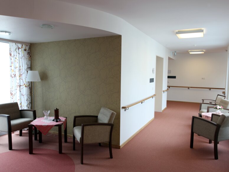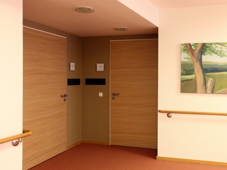 Le bâtiment est conçu de telle manière qu'il semble clair même aux patients atteints de démence, ce qui facilite leur orientation et leur perception. Le concept de couleur à l'intérieur du bâtiment favorise l'orientation des résidents. Chacun des quatre groupes résidentiels est affecté à une saison. Les couloirs et les chambres sont conçus en conséquence. Les mains courantes de HEWI constituent un autre système de guidage. Dans un bois de chêne noble, ils semblent accueillants et guident le résident en toute sécurité dans le bâtiment.