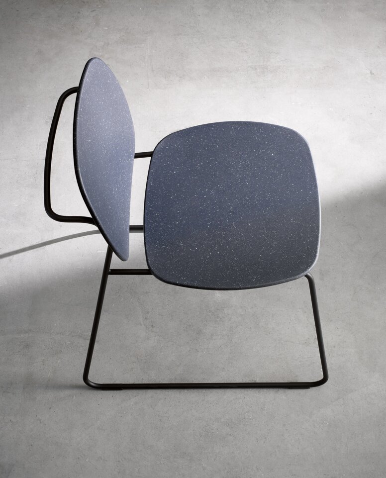 Susan Herrmann : Notre famille de sièges Re repose sur un design filigrane en tubes métalliques ronds, en version thermolaquée noire ou en chrome brillant. Pour la famille de sièges Re, les surfaces de l’assise et du dossier ainsi que les accoudoirs sont, comme nous l’avons déjà dit, en matière recyclée post-industrielle, ce qui fait de chaque meuble de salle de bain une pièce unique et constitue la plus grande particularité de ces produits.